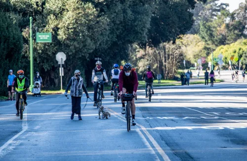 JFK Promenade is San Francisco’s newest public space, a haven for people exercising and socializing at the heart of San Francisco’s Golden Gate Park. The 1.5 mile car-free route hosts interactive art installations, weekend events and performances, social seating, and a seasonal beer garden. Initially closed to traffic during the early months of the health emergency to enable people to safely exercise, voters made the Promenade permanent in 2022 while enhancing access for all. As a result, for the first time in more than 100 years, there is a safe and sustainable way to travel by foot, bike, or skates from the east end of San Francisco’s Golden Gate Park to the edge of the continent at Ocean Beach.